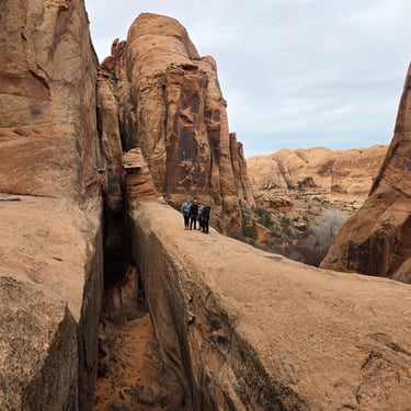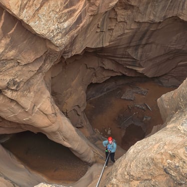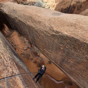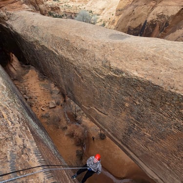 The hike down into the canyon is relatively easy, with some rocky and sandy terrain. The first rappel is over approximately 110 feet into the dark medieval chamber below. A short walk down this cool canyon, you'll encounter the second and final 130 foot free-hanging rappel, which will give an incredible experience of rappelling through the Morning Glory Arch.