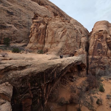 Once on the main canyon floor, you'll be greeted by the sound of trickling water and the sight of lush riparian vegetation. The spring that flows from the base of the arch creates a beautiful oasis, complete with a small stream and surrounding vegetation that continues all the way to the Colorado River. This spot is great for taking lunch or having a snack break before climbing out.