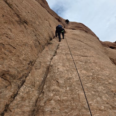 To get back to the vehicles, we’ll climb out of the canyon, which involves about 150 feet of technical, but easy climbing. You’ll be safely harnessed in and on belay the entire time, with guidance and support every step of the way. Don’t worry if you’re not an experienced climber or don’t feel strong — we have specialized equipment to assist you on the way up, making it manageable for nearly anyone with great hiking and scrambling abilities. Once we top out, it’s a fairly easy hike back to the vehicles through beautiful desert terrain.