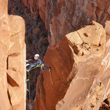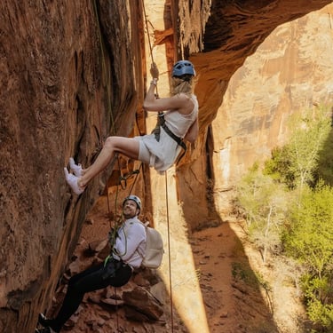 Learn essential climbing and canyoneering skills, including belaying, rappelling, anchor systems, and movement on sandstone — taught in real terrain, not a gym.
