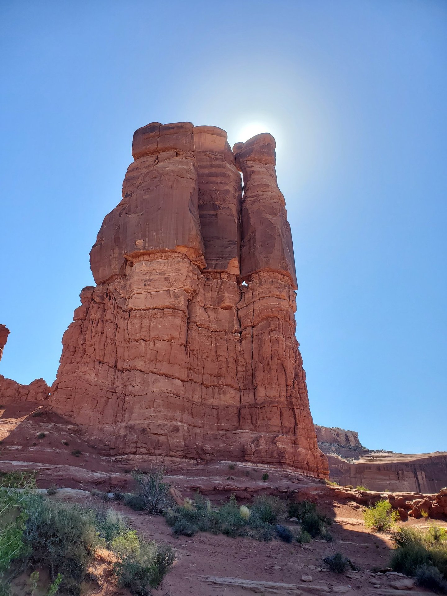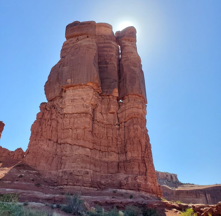 As you make your way to the base of the climb, you'll be surrounded by the rust-red hues of Southeastern Utah's iconic sandstone formations and vast expanses of desert landscape. The effort is well rewarded, as the climb begins with a 5.9 first pitch, followed by a second pitch that is mostly 5.10 with a few 5.11 moves. The most distinctive feature of this route is the "Windows" encountered halfway up, which require the use of funky offwidth, stemming, or other contortion techniques to ascend. The views from the top are breathtaking, offering panoramic views of Merrimack and Monitor Buttresses.
