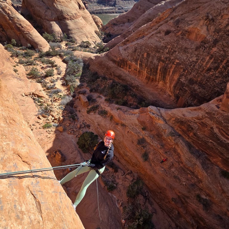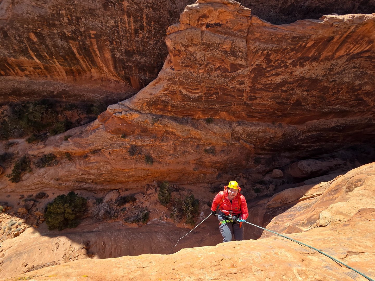 The canyon’s scenic highlights include views of Longbow Arch, theropod dinosaur tracks preserved in the sandstone, extensive petroglyph panels carved by the canyon’s original inhabitants, and sweeping views of the Behind the Rocks area. Despite its easy overall difficulty, the route delivers plenty of excitement, featuring four rappels along the way — including a dramatic 120-foot free-hanging rappel, the highlight of the canyon.