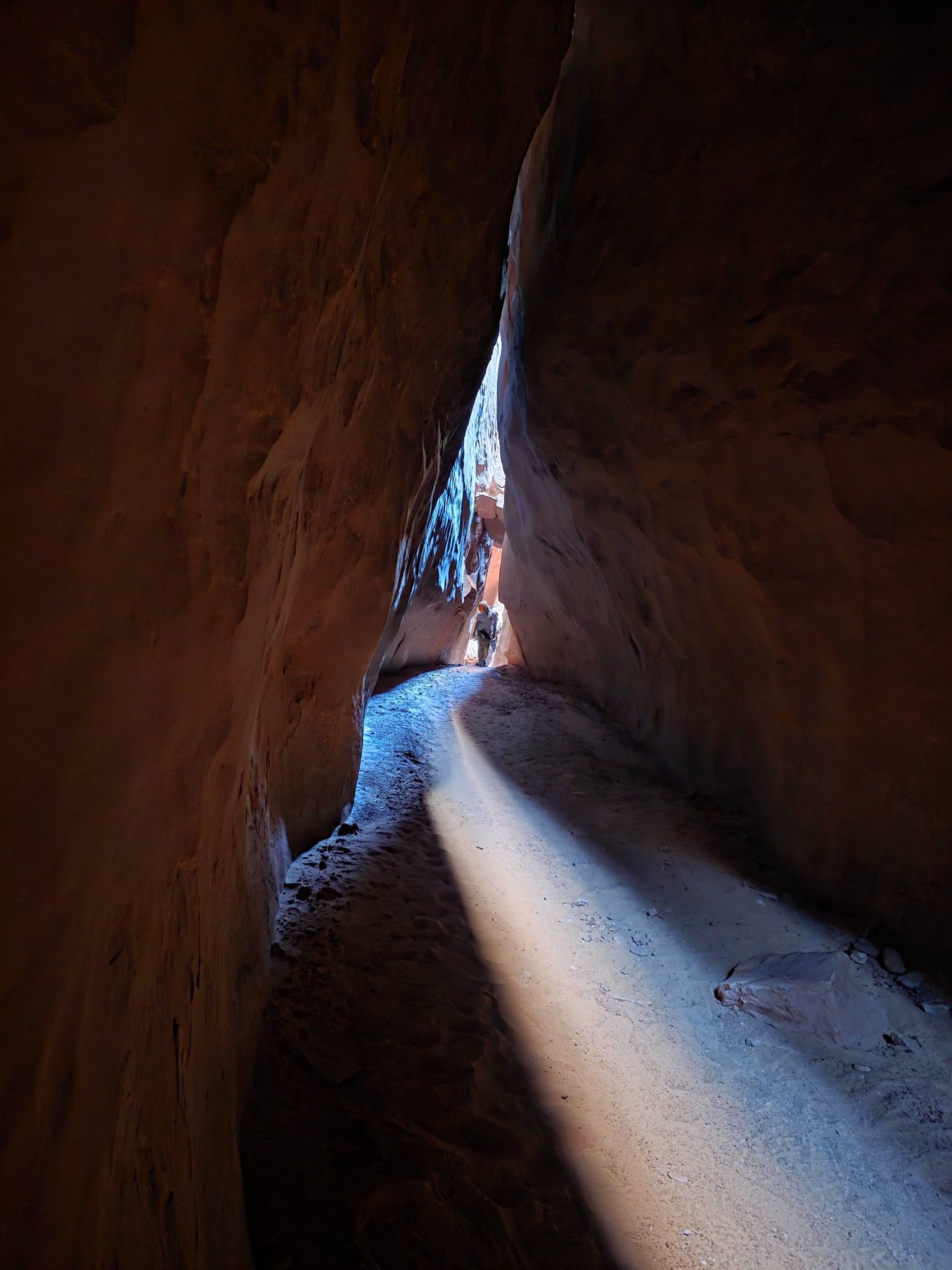 The canyon offers all the defining features of a classic slot: sculpted sandstone walls, narrow and shadowed passages, and an intimate, immersive feel. While the terrain is manageable and fun, it never feels trivial. Darker, tighter sections keep the experience engaging without becoming overwhelming, making Leprechaun an excellent introduction to slot canyon travel.