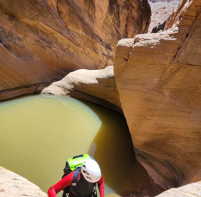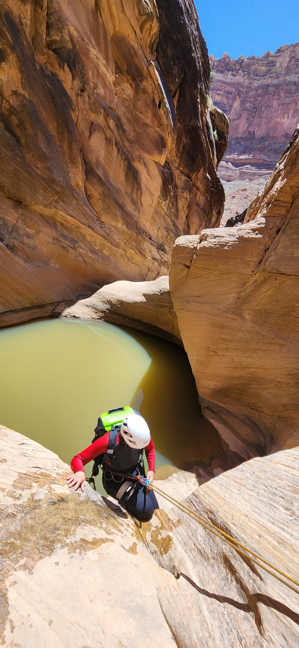 When you descend down into the canyon, you'll encounter a fair amount of scrambling and 2-3 rappels to start the actual canyon. Once you're in the canyon, you'll encounter pool after pool which can require some swimming depending on the water levels. While exiting these pools of water you'll get to rappel three more times throughout the canyon.