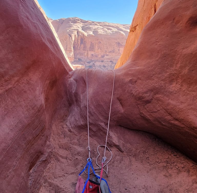 No Kidding Slot Canyon was established as a ghosting-only canyon, which means that no permanent anchors should be used. This means that we'll get to utilize the 'Sandtrap Anchor' method, which adds an extra layer of excitement and challenge to the rappelling sections. The canyon is mostly dry, but the steep walls and creative anchor work make it a very fun canyon that provides people with a comprehensive understanding of ghost anchors. With its unique combination of stemming, rappelling, and anchor work, this canyon is a must-visit for anyone looking to improve their skills and push their limits.