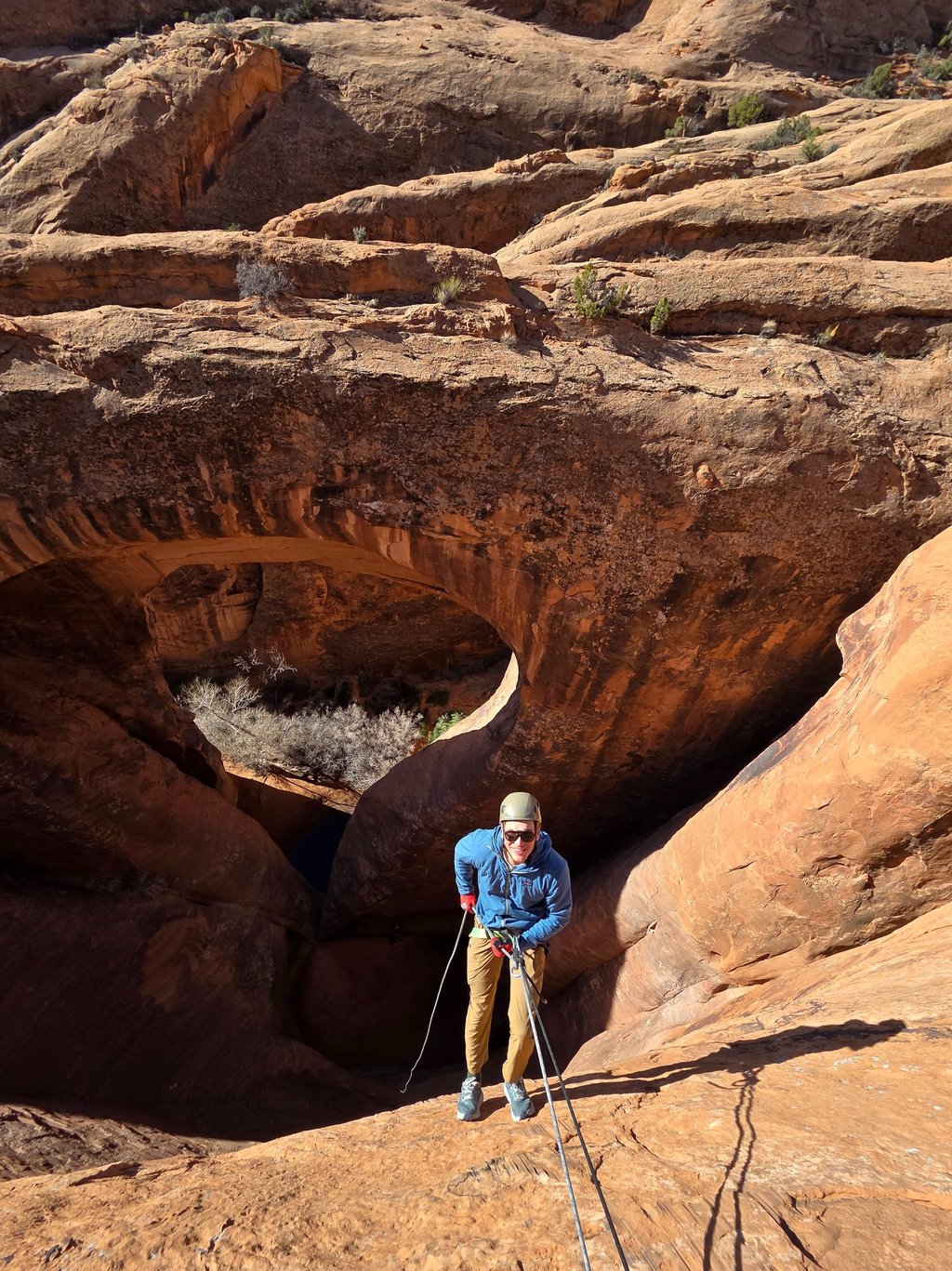 Along the hike you’ll visit two natural arches before reaching the technical portion of the canyon. The highlight is the 150-foot rappel into the pool below Pool Arch, one of the most unique rappels and arches in the Moab area.