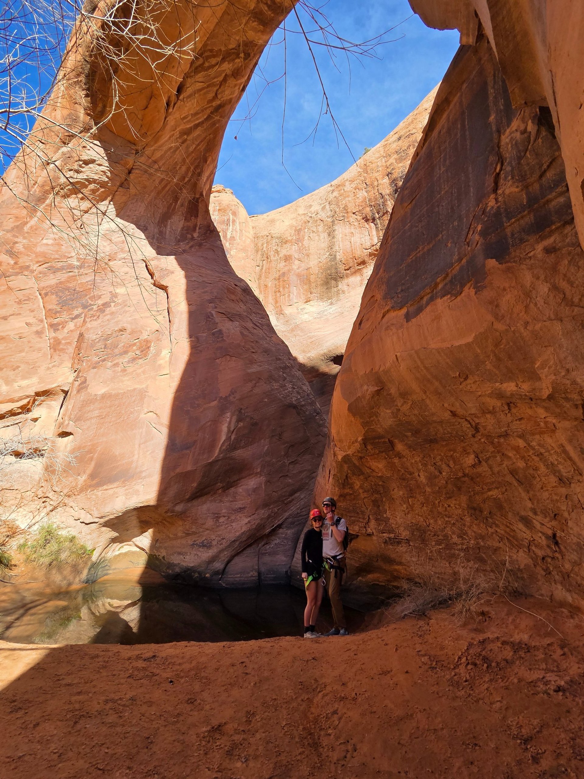 The technical section begins at Pool Arch, where the first rappel drops 130 feet into the pool below the arch. Just below the first rappel, you will encounter a short wade through a pool of water.