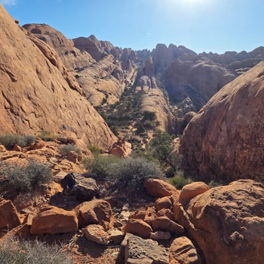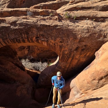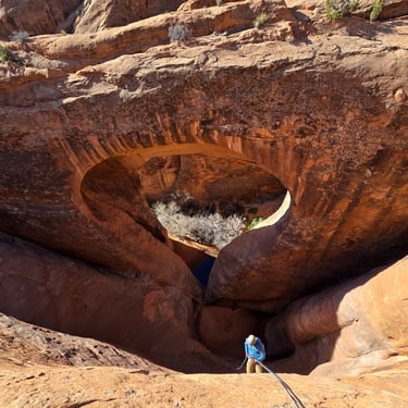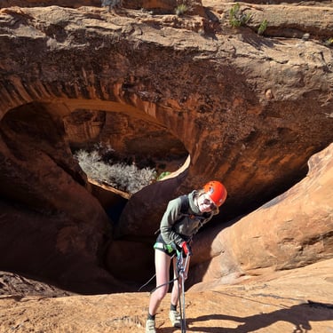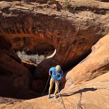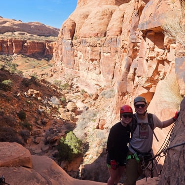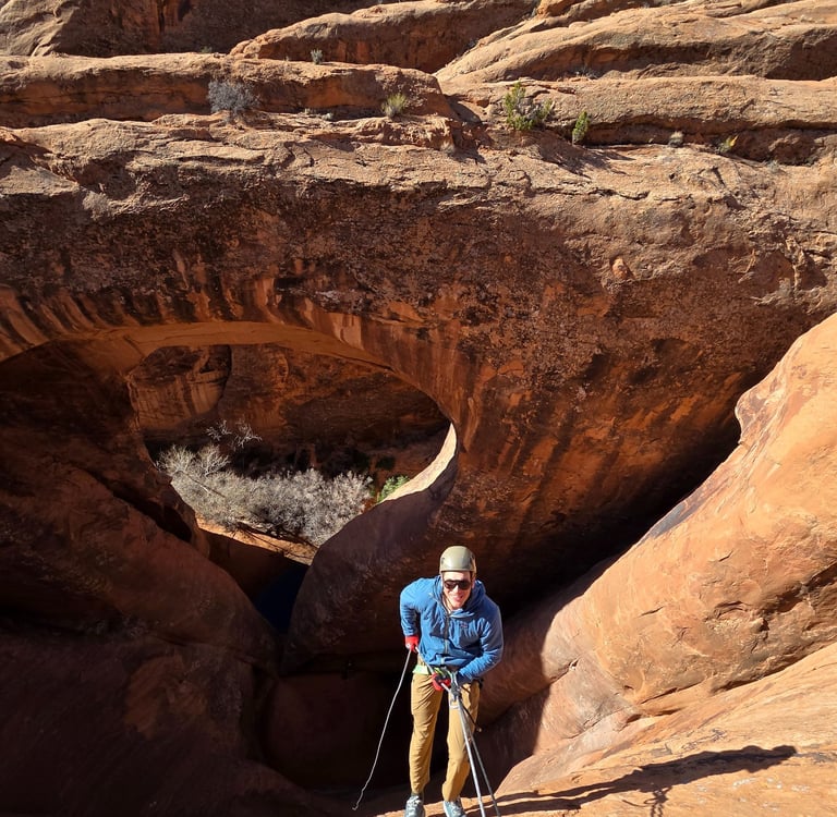 Pool Arch Canyon is a beautiful and approachable canyon adventure located just minutes from Moab. The route combines a scenic desert hike through towering sandstone fins with a short but exciting technical section featuring three rappels.