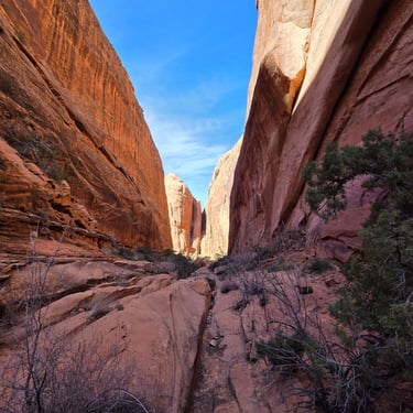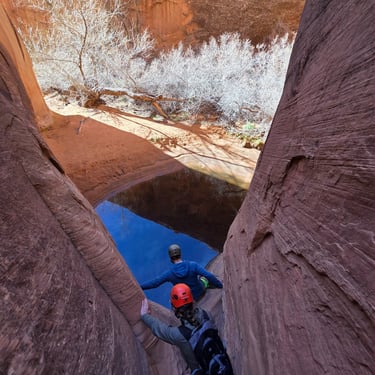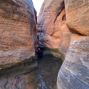 After continuing down canyon, you enter into a unique slot canyon section where you will get to practice some stemming and downclimbing techniques. This section also tends to hold some water, which may require wading for 15 feet.